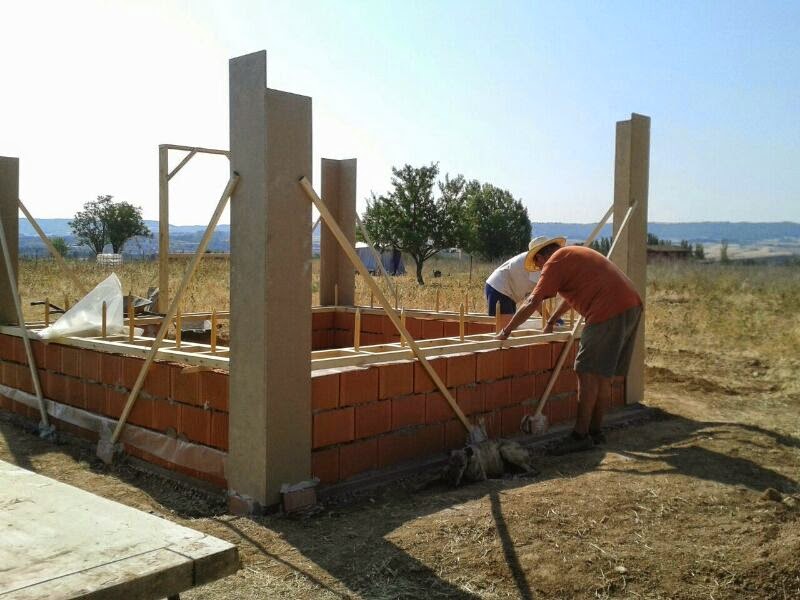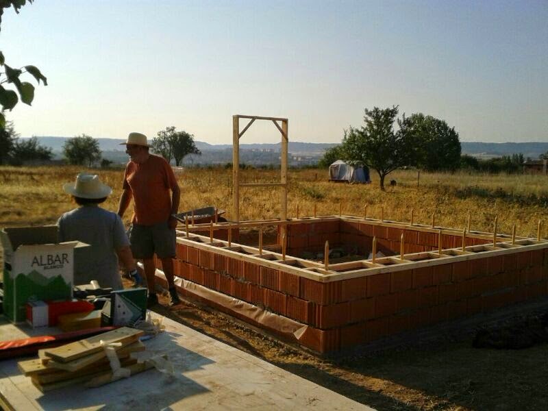 Ha llegado el momento de levantar los muros de paja, pero antes colocamos sobre los muretes de ladrillos un marco de madera que no reposará directamente sobre los bloques sino sobre un plástico. Este plástico es una barrera antihumedad. Recordad que la paja es tremendamente vulnerable al ataque de hongos que crecerán en las pacas en cuanto puedan. Nosotras cometimos el error de olvidarnos del plástico y nos dimos cuenta cuando el marco estaba completamente montado. Las ganas de avanzar nos vencieron. El marco lleva unas estacas verticales en las que se pincharán las primeras hiladas de fardos de paja.