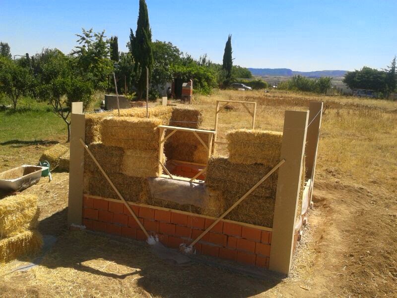 Nuestro vecino Ángel nos ha echado una mano a subir algunas de las pacas de la penúltima hilada porque aún no hemos montado el andamio y teníamos verdaderas dificultades para llegar.