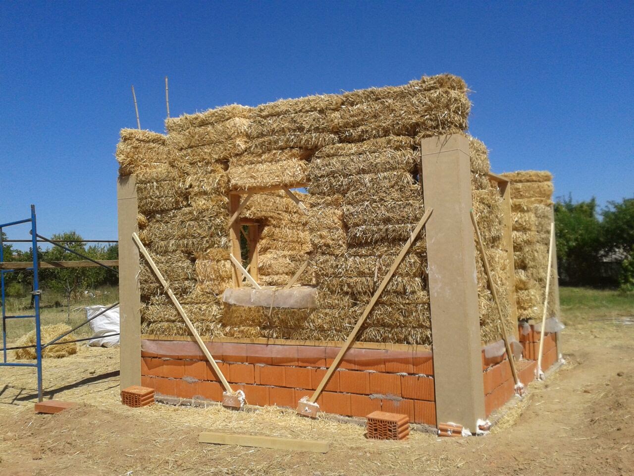 Estas grapas nos han servido para estabilizar las esquinas. También aproveché para cortar unas cañas y usarlas a modo de estacas por cada paca a partir de la tercera hilada. No es que esto tenga función estructural alguna pero si se estacan los muros se mueven menos y da menos miedo.
