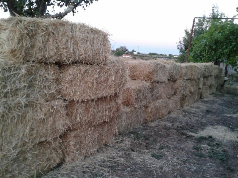 Así que venga paca y venga pajas, que no os hacéis idea de cómo pica todo... y con todo me refiero a TODO, sí sí, eso y aquello también, que llegas a casa y te vas a duchar y se te cae medio belén de las bragas... En tres horitas y dos viajes nos hemos metido 57 balas de paja en la fragoneta, nos hemos ido hasta la huerta, las hemos descargado y las hemos apilado en el bello murete que véis arriba, 57 balas como 57 soles... ¿os he dicho ya que cada una pesa entre 10 y 20 kilos? Pues eso. Que somos unas monstruas.
