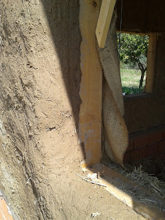 Esa tela de saco que asoma por dentro, la ponemos porque en el lugar de unión del barro y el precerco, suelen salir grietas. El saco ca clavado a la madera y hace que la transición madera-paja sea progresiva. Esperamos así minimizar la aparición de grietas. Pues ahí queda. Mañana más.